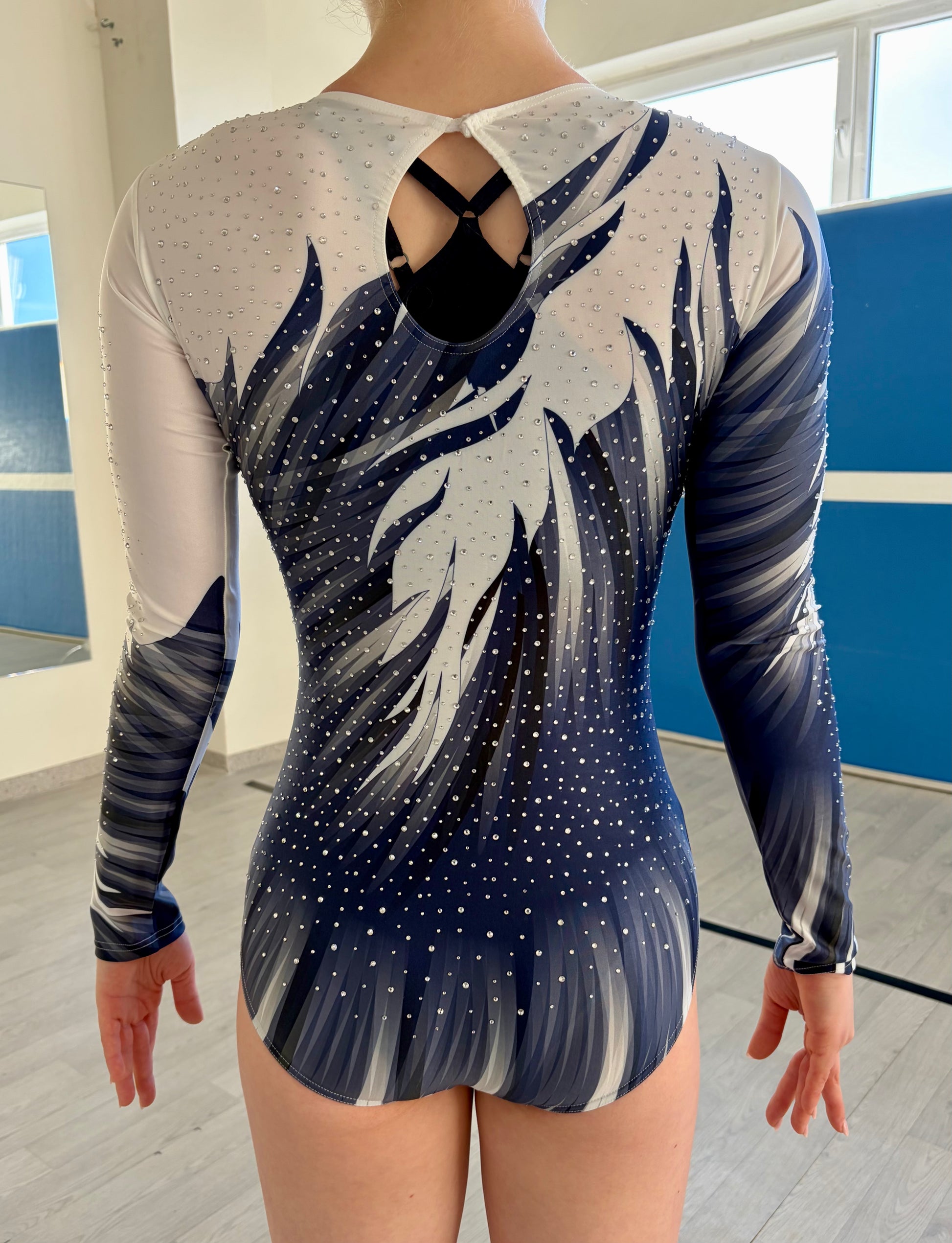 Spausdintas triko, visas nusėtas klijuojamomis akutėmis. Itin tamprus, pritaikytas gimnastikos sporto šakai.